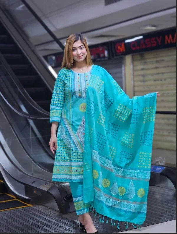 হ্যান্ড এমব্রয়ডারি এবং কালার গ্যারান্টেড - ব্লক-প্রিন্টেড কালারফুল পোশাকের  জগতে আপনাকে স্বাগতম! পরম যত্নে তৈরী করা আমাদের পোশাকগুলি ঐতিহ্য, স্বাচ্ছন্দ্য এবং শৈলীকে একত্রিত করে, যা আপনাকে একটু বেশি বিশেষ করে তোলে। যেকোনো অনুষ্ঠান বা ভ্রমণের জন্য আমাদের এই থ্রি পিস্ হতে পারে আপনার জন্য পারফেক্ট কালেকশন।